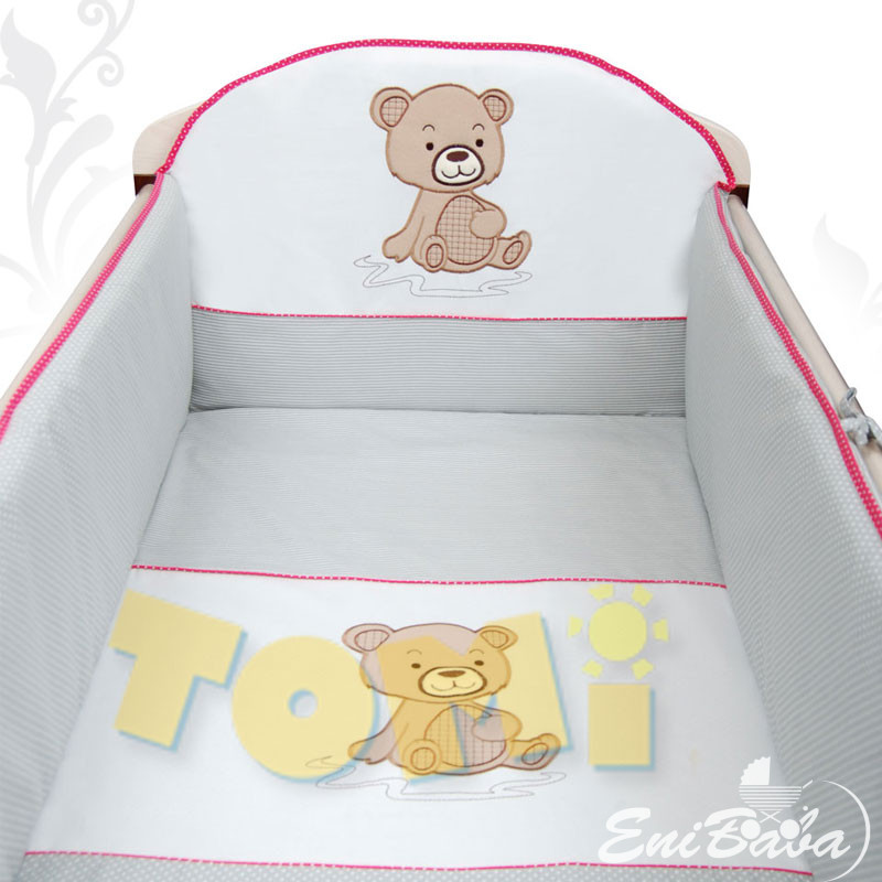 TOMI 4 RÉSZES ÁGYNEMŰ HUZAT, HÍMZETT SZÜRKE MACIS, LÁNYOS, KÉSZLETEN, AZONNAL ELVIHETŐ!