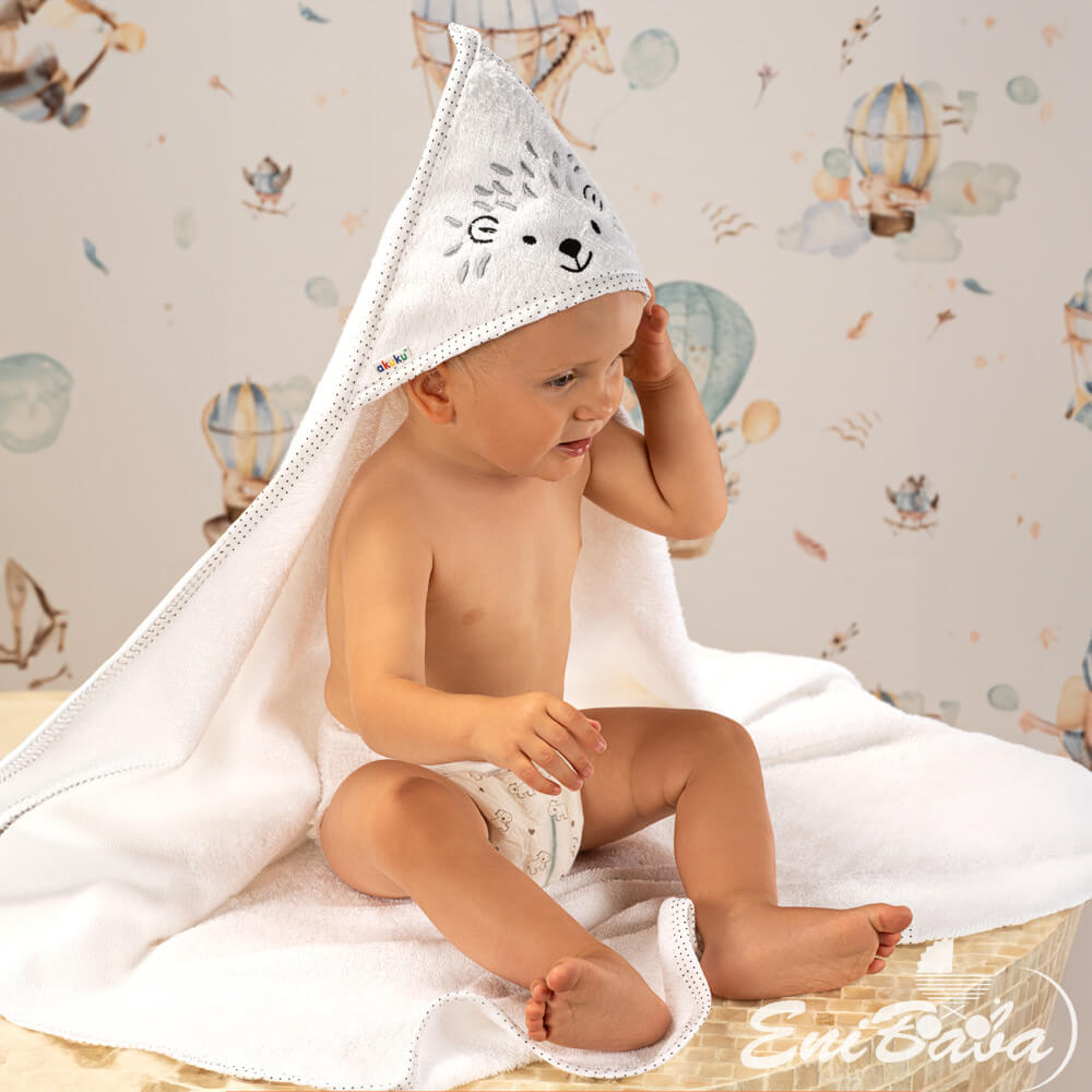 A fehér színű törölköző letisztult és elegáns megjelenést biztosít, amely minden fürdőszobai környezethez illeszkedik. Az egyszerűségében rejlik a szépsége, így nem csupán praktikus, de esztétikus kiegészítője is lehet a babaápolási kelléktárnak.