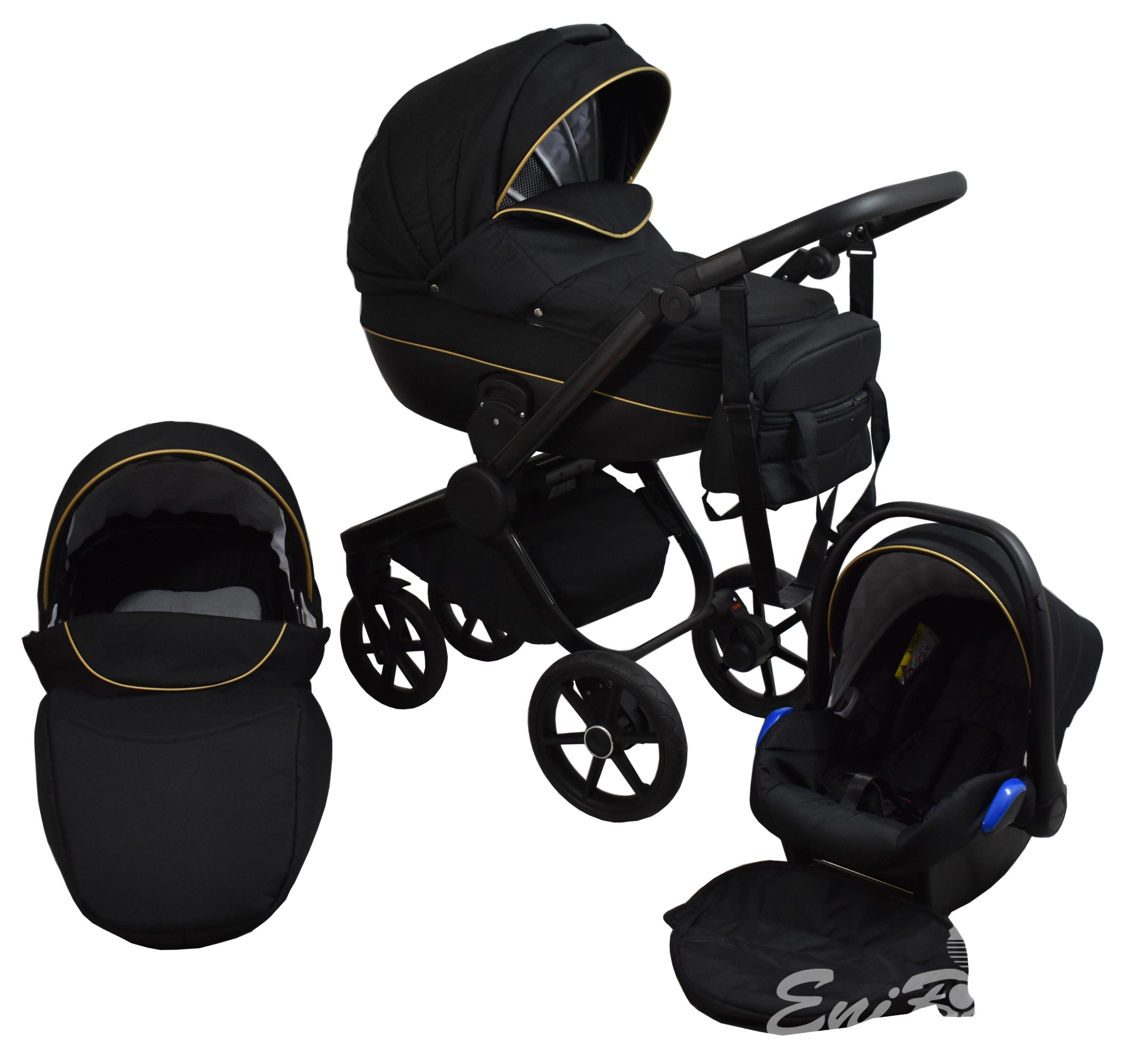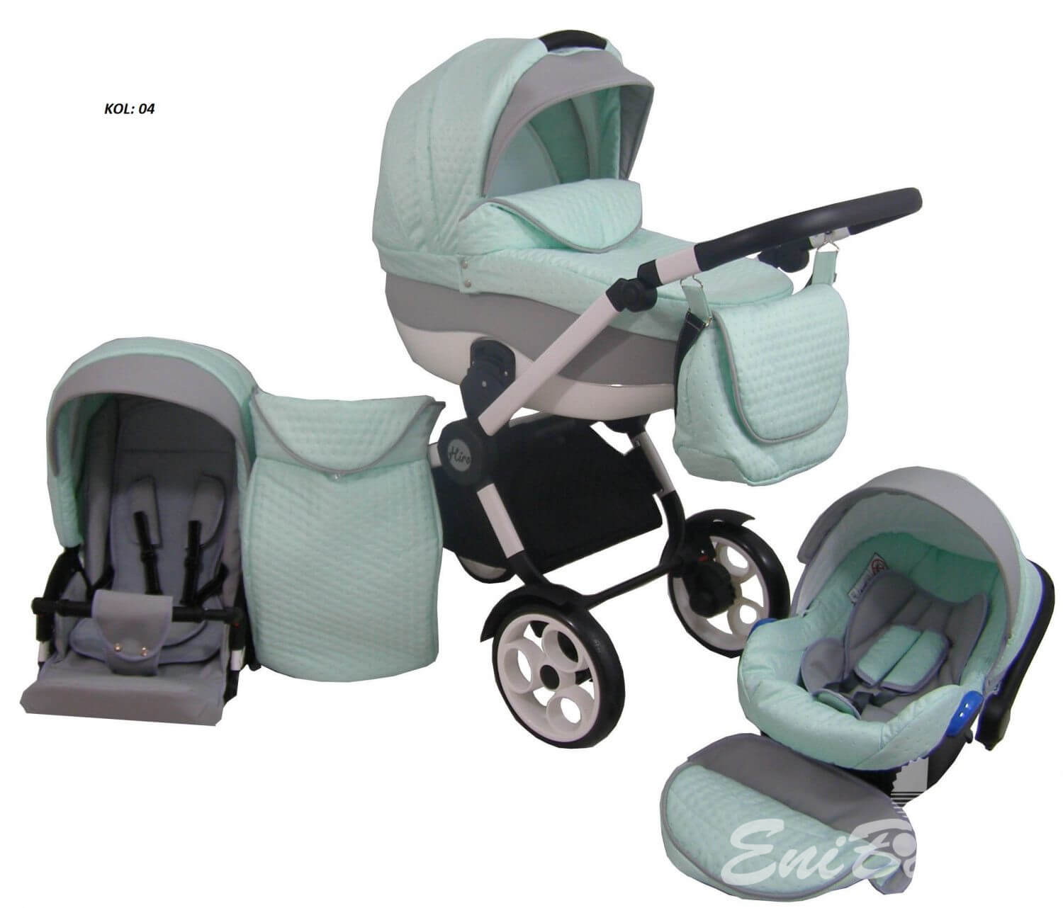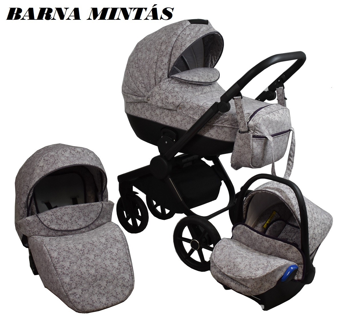 • Multifunkciós babakocsi: babakocsi vázszerkezet +mózeskosár+sportrész+autósülés babakocsi színével azonos.